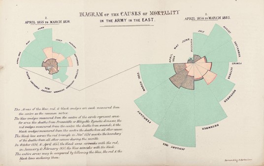 The polar area diagram was invented by Florence Nightingale to dramatize the extent of needless deaths in British military hospitals during the Crimean War (1954-56). The area of each coloured wedge, measured from the centre, is proportional to the statistic being represented. Blue wedges represent deaths from “preventable or mitigable zymotic” diseases (contagious diseases such as cholera and typhus, pink wedges deaths from wounds and Gray wedges deaths from all other causes. Mortality peaked in January 1855 when 2761 died of contagious diseases, 83 of wounds and 324 of other causes. Based on the army’s average strength of 32393, Nightingale computed an annual mortality rate of 1174 per 1000.